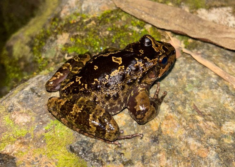 Pequena rã é avistada entre as pedras do Parque dos Três Picos, em Cachoeiras de Macacu